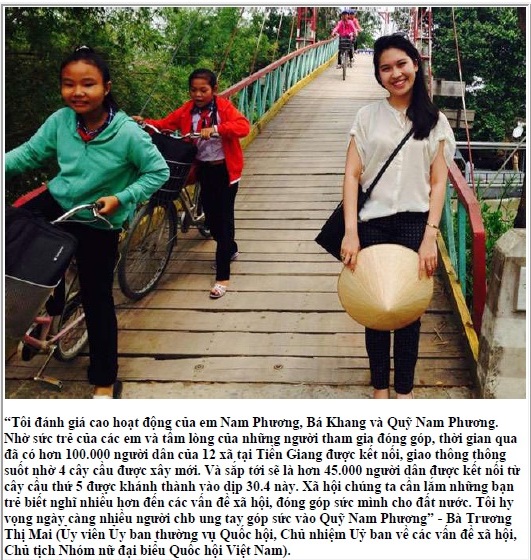 Lúc đầu, khi được phỏng vấn hay khen ngợi thì em cũng khá xấu hổ, vì tuy quỹ do mình khởi xướng thực hiện nhưng được gia đình và mọi người xung quanh giúp đỡ rất nhiều. Em thấy ở Việt Nam, người làm từ thiện rất nhiều, em cũng từng tham gia nhiều hoạt động như quán ăn 2.000 đồng, quyên góp giày cho trẻ em vùng cao, nuôi heo đất cho dịp tết, giúp các ngôi chùa chăm sóc các cụ lớn tuổi… nhưng các hoạt động này ít được hệ thống hoá. Riêng việc xây cầu thì khác, vì kinh phí cao để có được sự ủng hộ từ bạn bè và tổ chức quốc tế thì việc thành lập quỹ chính thức là rất quan trọng.