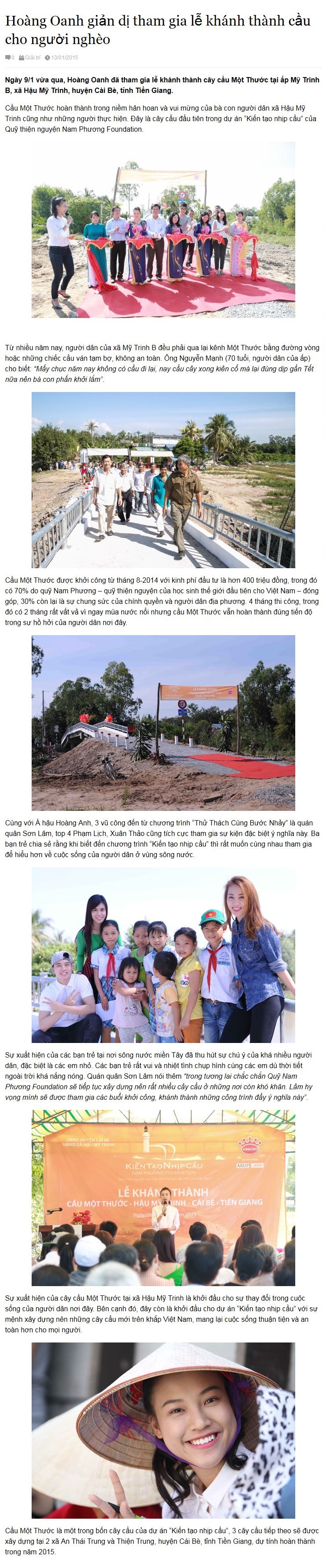 Viết về chúng tôi Hoa Học Trò 13/01/2015 – Hoàng Oanh giản dị tham gia lễ khánh thành cầu cho người nghèo Posted on 14/01/2015 by admin Bài viết liên quan HẬU GIANG, BẠC LIÊU RỘN RÀNG NGÀY QUỸ NAM PHƯƠNG KHÁNH THÀNH 2 CÂY CẦU MỚI QUỸ NAM PHƯƠNG: KIẾN TẠO NHỊP CẦU MÙA 10 CÙNG HẬU GIANG VÀ BẠC LIÊU Quỹ Nam Phương khởi công cầu Khang Ninh tại An Giang Báo Zing – Quỹ Nam Phương phối hợp Công ty Tôn Đông Á xây cầu Khang Mỹ [Kiến Tạo Nhịp Cầu – Mùa 7] Tập 1