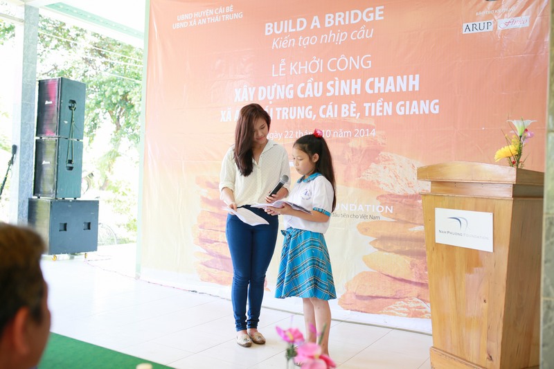 Vừa giữ vai trò đại sứ thiện nguyện, vừa là MC của buổi lễ, Phương Vy cho biết “đã rất vui khi được đến đây ngày hôm nay, cùng chia sẻ với tất cả bà con sự phấn khởi khi chuẩn bị có một cây cầu mới xây dựng. Phương Vy có thể thấy được niềm hân hoan hiện rõ trên mặt các em nhỏ và nụ cười hạnh phúc của các cụ già”.
