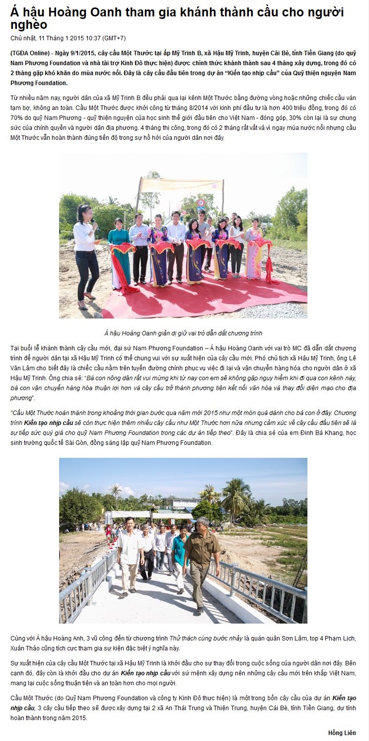 Viết về chúng tôi thegioidienanh.vn 11/01/2015 – Á hậu Hoàng Oanh tham gia khánh thành cầu cho người nghèo Posted on 14/01/2015 by admin Bài viết liên quan HẬU GIANG, BẠC LIÊU RỘN RÀNG NGÀY QUỸ NAM PHƯƠNG KHÁNH THÀNH 2 CÂY CẦU MỚI QUỸ NAM PHƯƠNG: KIẾN TẠO NHỊP CẦU MÙA 10 CÙNG HẬU GIANG VÀ BẠC LIÊU Quỹ Nam Phương khởi công cầu Khang Ninh tại An Giang Báo Zing – Quỹ Nam Phương phối hợp Công ty Tôn Đông Á xây cầu Khang Mỹ [Kiến Tạo Nhịp Cầu – Mùa 7] Tập 1