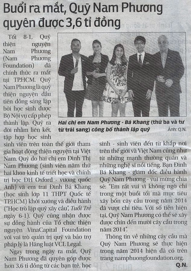 Viết về chúng tôi TUỔI TRẺ 10/01/2014: Buổi ra mắt, Quỹ Nam Phương quyên được 3,6 tỉ đồng Posted on 10/01/2014 by admin Bài viết liên quan HẬU GIANG, BẠC LIÊU RỘN RÀNG NGÀY QUỸ NAM PHƯƠNG KHÁNH THÀNH 2 CÂY CẦU MỚI QUỸ NAM PHƯƠNG: KIẾN TẠO NHỊP CẦU MÙA 10 CÙNG HẬU GIANG VÀ BẠC LIÊU Quỹ Nam Phương khởi công cầu Khang Ninh tại An Giang Báo Zing – Quỹ Nam Phương phối hợp Công ty Tôn Đông Á xây cầu Khang Mỹ [Kiến Tạo Nhịp Cầu – Mùa 7] Tập 1